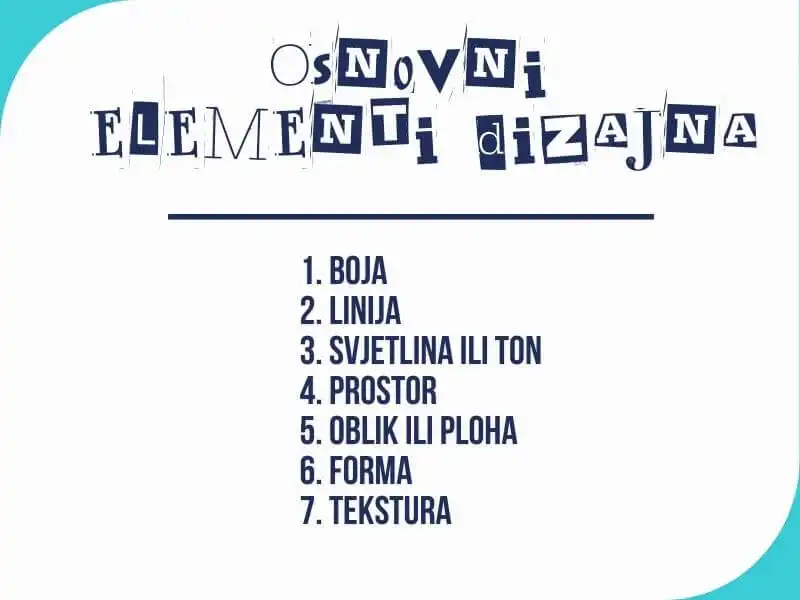 Osnovni elementi dizajna su: boja, linija, svjetlina ili ton, pozitivni i negativni prostor, oblik ili ploha, forma, i tekstura. Ovih sedam elemenata grade apsolutno sve materijale dizajna bili oni na ekranu ili otisnuti. Samo ih je sedam, a načina na koji ih se može koristiti je bezbroj.