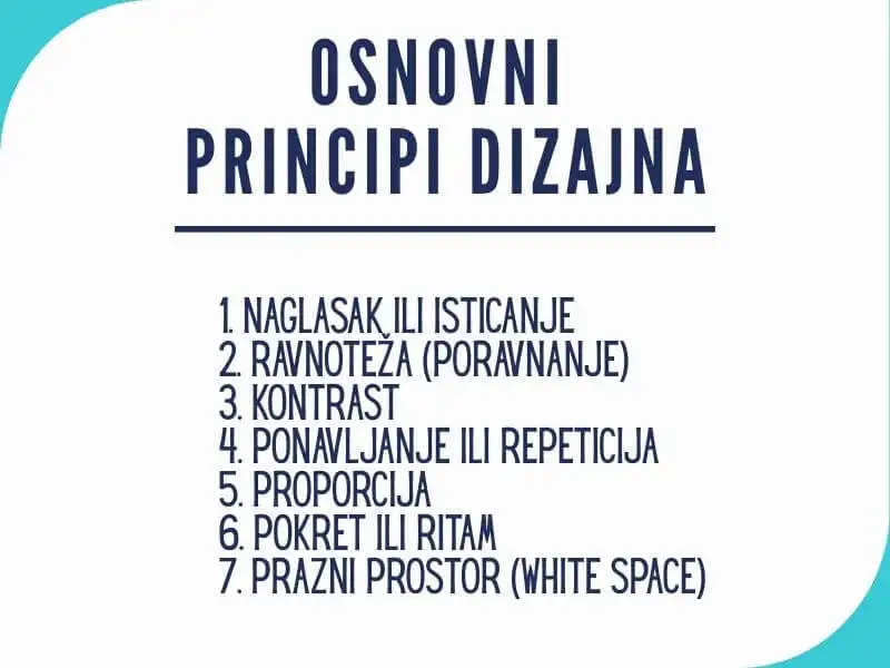 Osnovni principi dizajna su: naglasak ili isticanje, ravnoteža, kontrast, ponavljanje, proporcija, pokret, i prazni prostor. Na internetu možete pronaći popise s puno više, ili manje, principa, no, ja smatram da se s ovih sedam može pokriti sve što nam je potrebno kako bi prepoznali dobar i funkcionalan dizajn plakata, logotipa ili brošure.